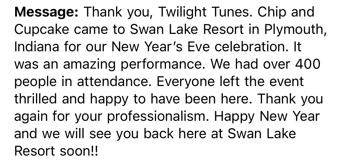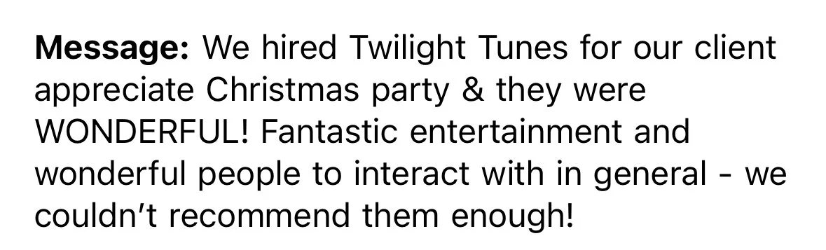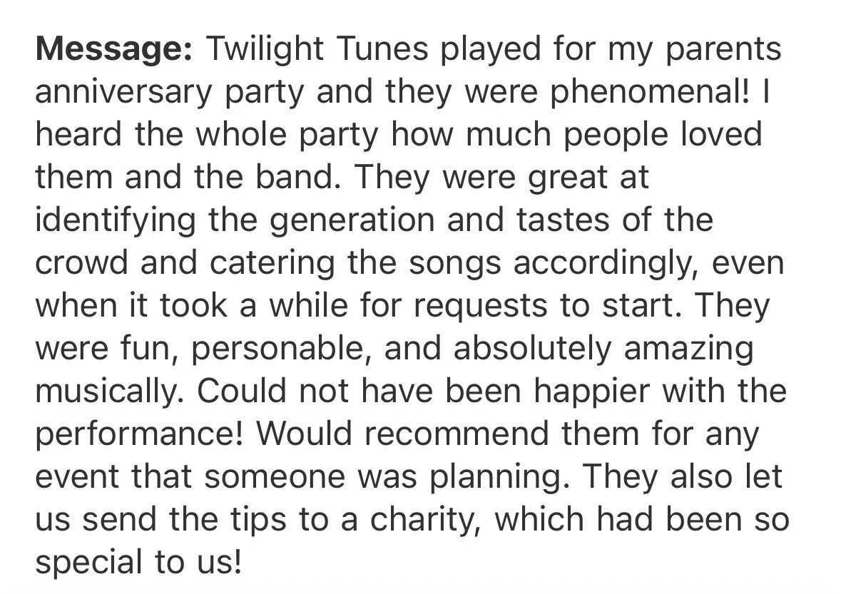 With the support from our clients and fans, Twilight Tunes can continue to provide entertainment and good vibrations! Below are a few things our clientele has said about us…